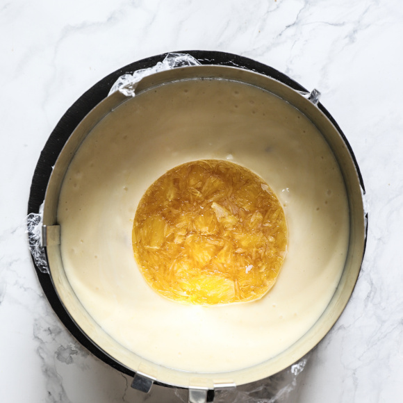 Силиконовой лопаткой аккуратно перекладываем апельсиновый мусс в кольцо, сверху посередине кладем замороженное компоте, слегка утапливая его в муссе. Ставим в морозильную камеру.
