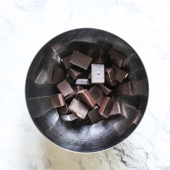 Темный шоколад ломаем на кусочки и растапливаем на водяной бане или в микроволновке на средней мощности. Оставляем остывать.