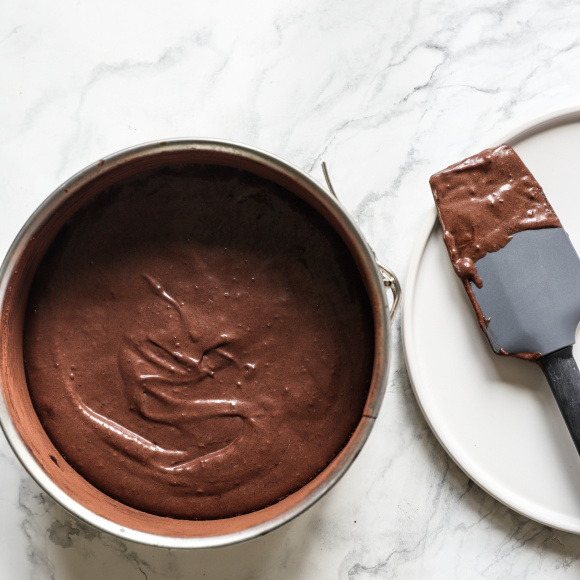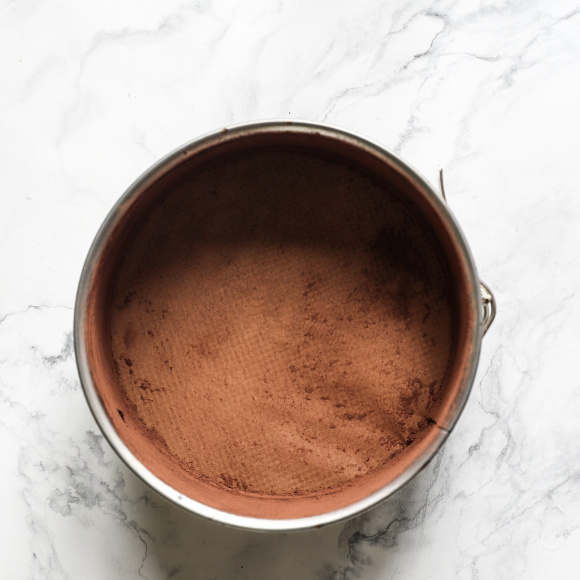 Подготавливаем форму для выпечки. Дно застилаем пергаментной бумагой. Стенки формы смазываем сливочным маслом и присыпаем какао-порошком. (В кулинарии данный прием называется «французская рубашка», кроме какао также для присыпания используется пшеничная мука, миндальная мука, панировочные сухари.)