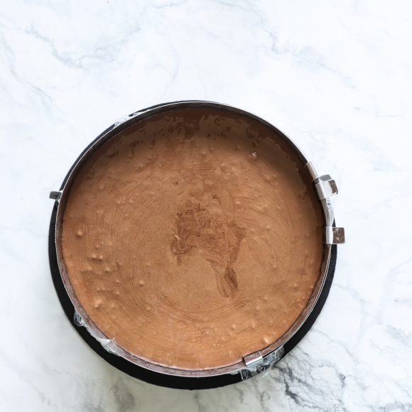 На шоколадный мусс кладем испеченный бисквитный корж. Не вдавливаем его в мусс, стараемся чтобы корж лежал ровно. Убираем торт в морозилку.