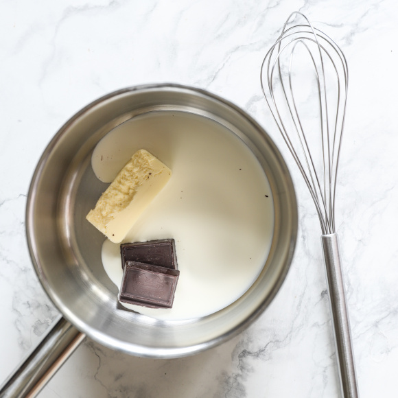 В кастрюлю с толстым дном перекладываем поломанный шоколад (обязательно темный с содержанием какао от 56%) и свежее сливочное масло. Ставим кастрюлю на плиту и на медленном огне, постоянно помешивая, прогреваем массу, не доводя до кипения. Как только сливки полностью соединены с шоколадом, а консистенция стала однородной, снимаем с огня и даем немного остыть.