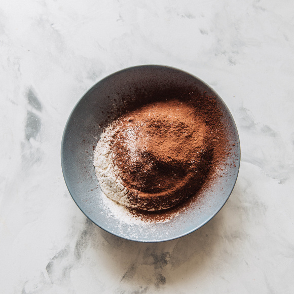 В отдельную емкость просеиваем муку высшего сорта, добавляем разрыхлитель теста Dr. Bakers и какао-порошок Dr. Bakers, венчиком перемешиваем сухую смесь и добавляем к жидким ингредиентам. Деревянной или силиконовой лопаткой перемешиваем тесто.