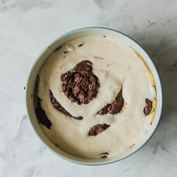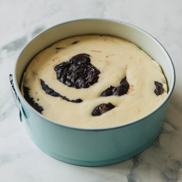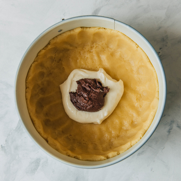 Достать форму с тестом из холодильника и, чередуя по одной ложке светлую начинку с темной, выкладывать ее в форму.