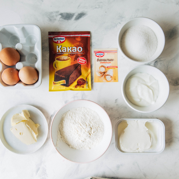 Подготовленную начинку разделить на 2 равные части. В одну из них добавить 30 г какао-порошка, перемешать.