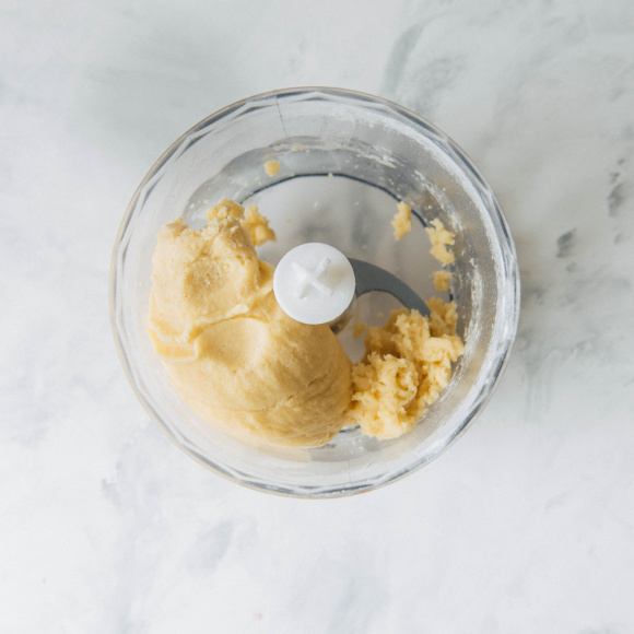 Для приготовления теста необходимо все ингредиенты поместить в чашу блендера (с ножами для рубки овощей) и перемешать до образования гладкого теста. Если у вас нет блендера, то можно руками растереть масло с мукой и сахаром, а затем добавить яйцо и замесить однородное тесто.