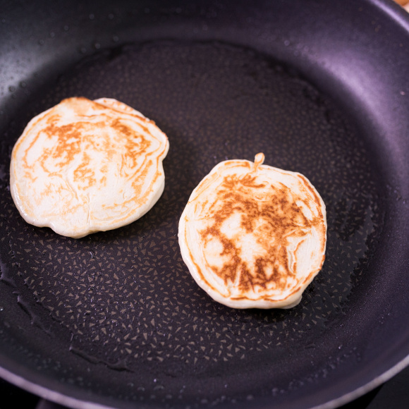 Непосредственно перед жаркой оладий смазываем сковороду растительным маслом при помощи силиконовой кисточки. Разогреваем сковороду на среднем огне. Тесто из ёмкости набираем аккуратно, желательно у самой стенки, чтобы лишний раз его не взбалтывать. Придаём оладьям на сковороде желаемую форму и размер и жарим их до золотистого цвета с обеих сторон. Так получаются пышными традиционные оладьи на кефире.