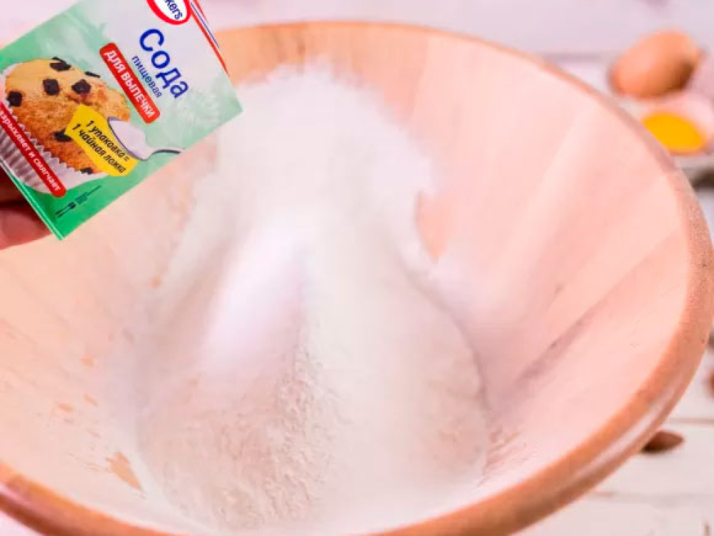 Через мелкое сито просеиваем 400 г муки, добавляем в неё 1/2 ч. л. соды и тщательно перемешиваем получившуюся смесь, чтобы оладьи на кефире были пышными.