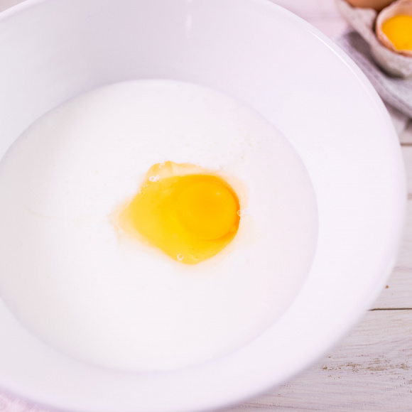 Подготовив мучную смесь, переходим к приготовлению жидкой части. В глубокую ёмкость разбиваем одно яйцо, добавляем 500 мл кефира и треть ч.л. соли.