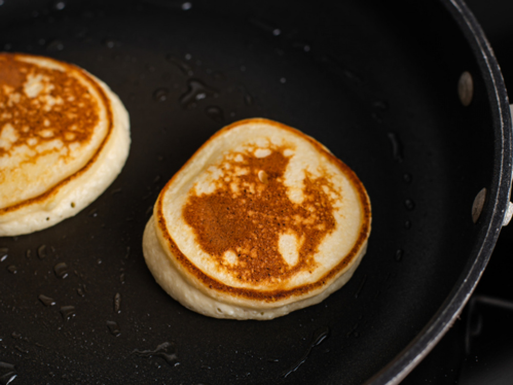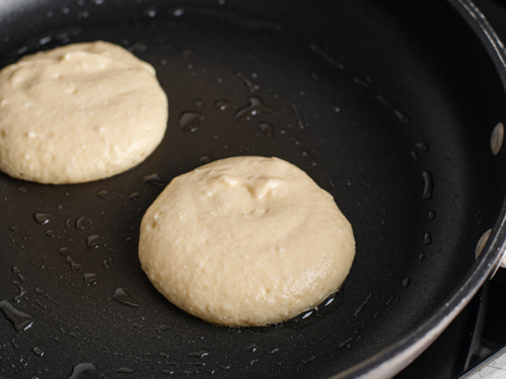 Нагреваем сковороду. Выливаем небольшое количество масла, столовой ложкой выкладываем тесто и жарим оладушки с двух сторон на среднем огне.