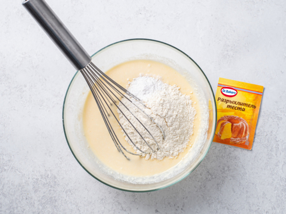 Всыпаем муку и разрыхлитель. Замешиваем тесто (оно должно быть не слишком густое и не слишком жидкое). Если тесто густое, то подливаем немного молока и вновь перемешиваем.