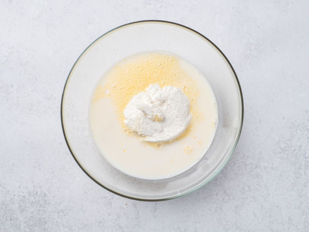 В миске смешиваем яйца, соль и сахарную пудру. Все перемешиваем венчиком.