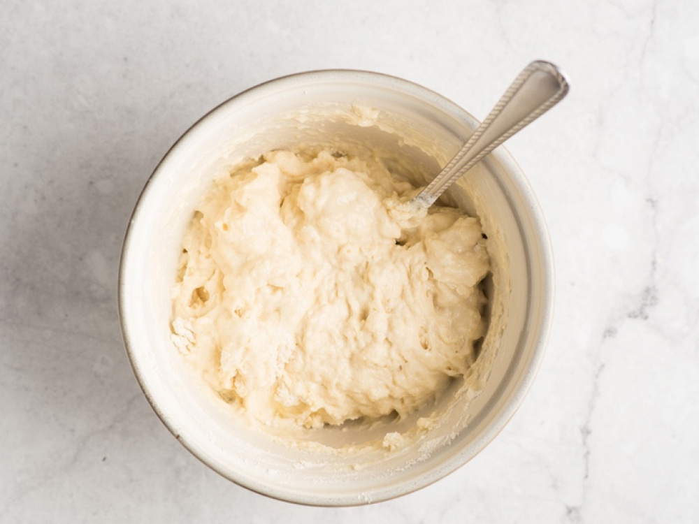 Кефир смешиваем с яйцом и вводим в мучную смесь, перемешиваем до объединения и оставляем на 30 минут под полотенцем.