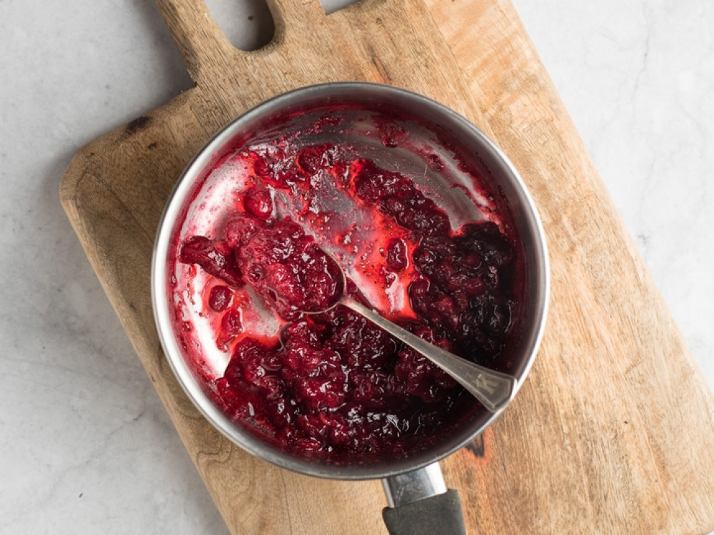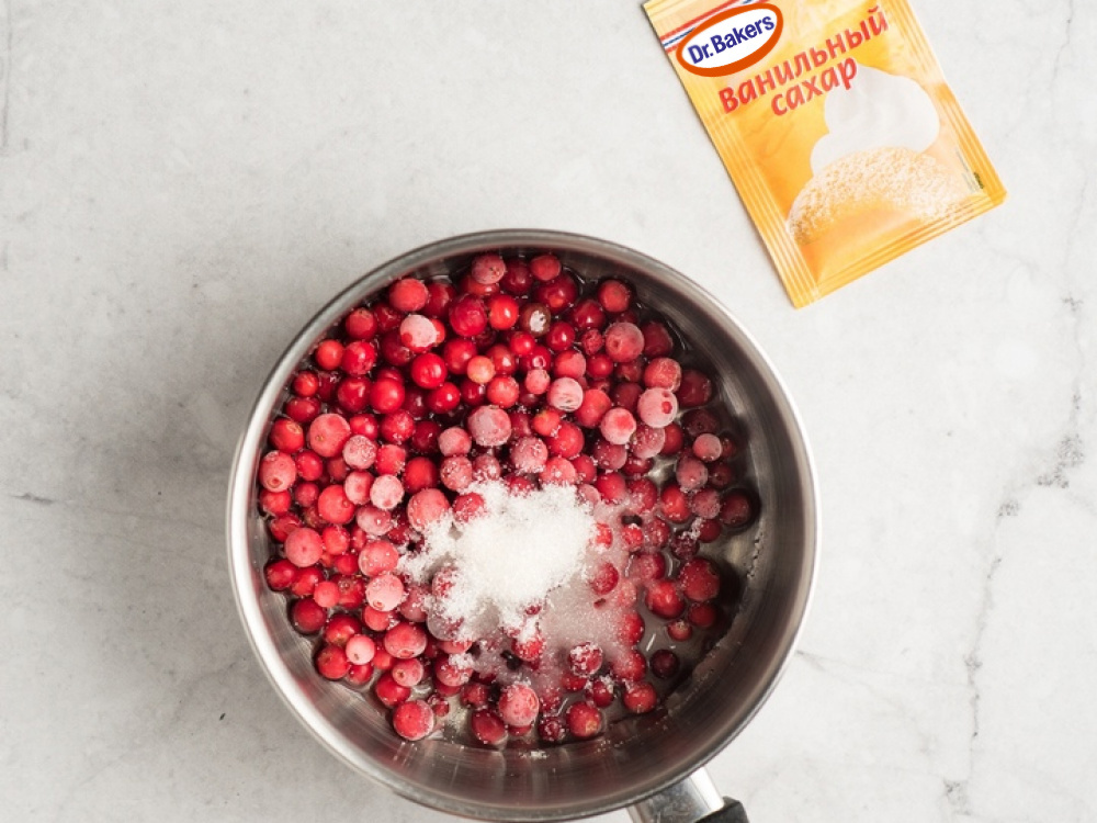 Готовим ягодный соус: в сотейник складываем ягоды, сахар, ванильный сахар и вливаем воду.