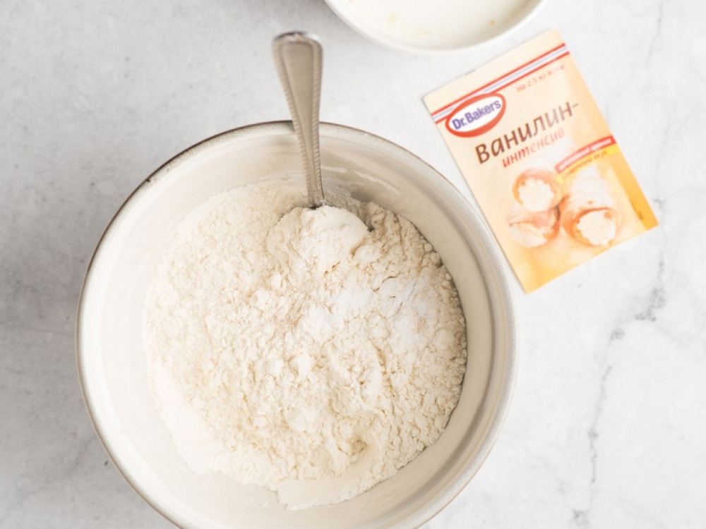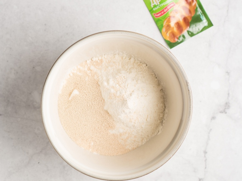 Готовим тесто: для этого муку смешиваем с дрожжами.