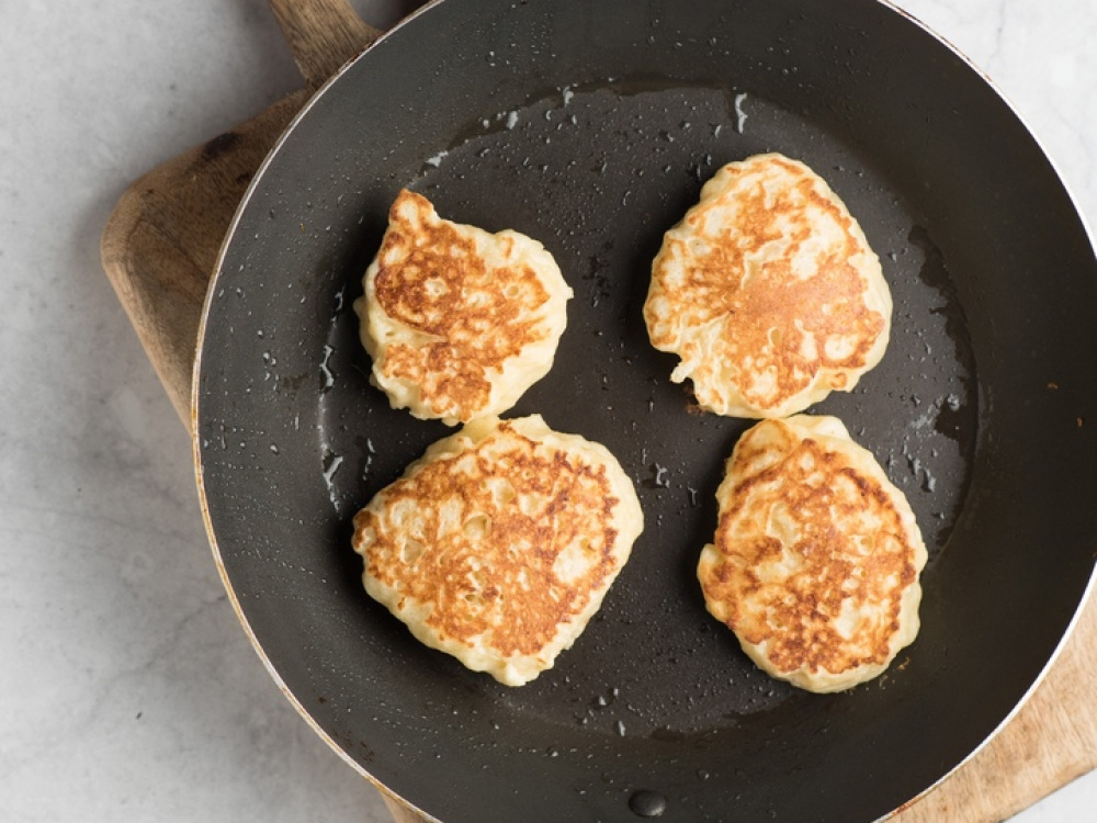 Разогреваем сковороду и не перемешивая тесто, аккуратно набираем ложкой и готовим в масле с обеих сторон на умеренном огне.
