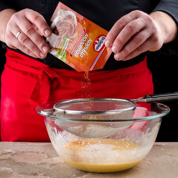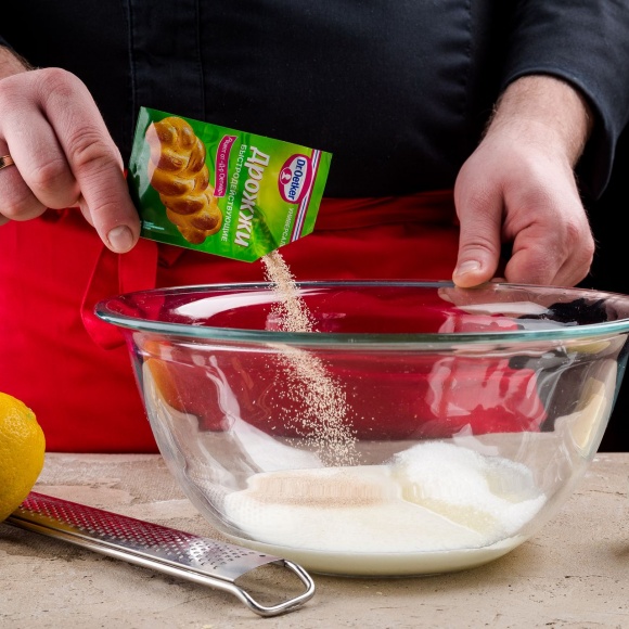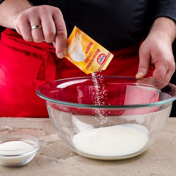 Кефир помещаем в глубокую ёмкость, добавляем 1 пакетик дрожжей Dr. Oetker, слегка перемешиваем и оставляем на 10 минут.