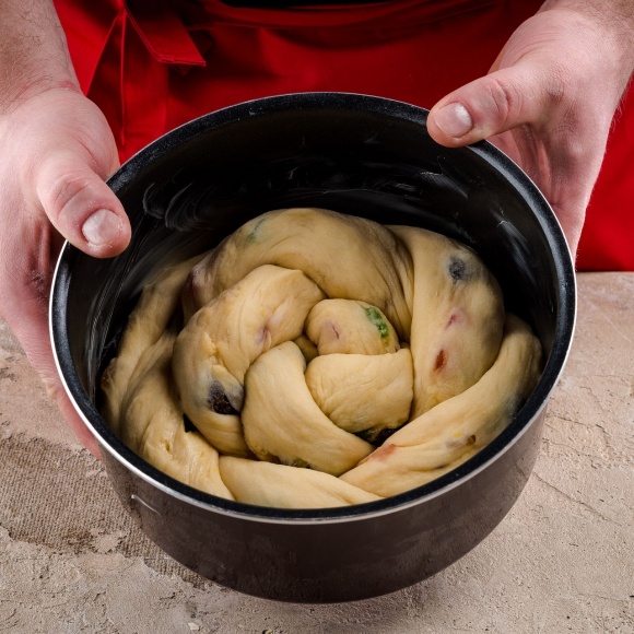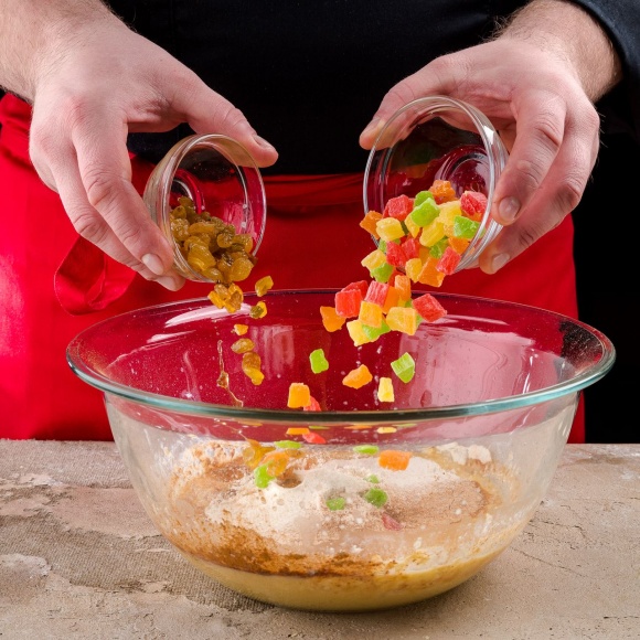 Цукаты рубим произвольными мелкими кусочками. Изюм перебираем, промываем под проточной водой и обсушиваем (можно заранее замочить изюм в коньяке или роме). Не переставая месить тесто, добавляем в него изюм и цукаты. Готовое тесто должно получиться мягким, гладким и не прилипать к рукам. Перекладываем тесто в предварительно смазанную растительным маслом глубокую ёмкость и оставляем в теплом месте на 1-1,5 часа для подъема.