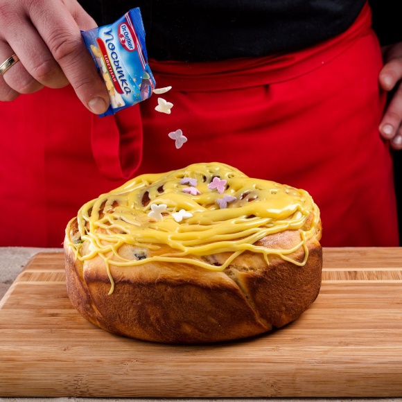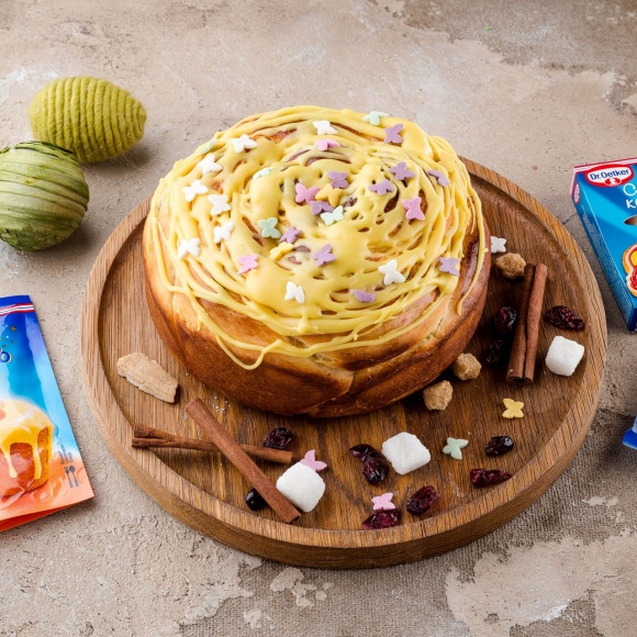 Готовый пасхальный пирог украшаем кондитерской посыпкой “Бабочки” Dr. Oetker, перекладываем на сервировочное блюдо и подаем к праздничному столу!