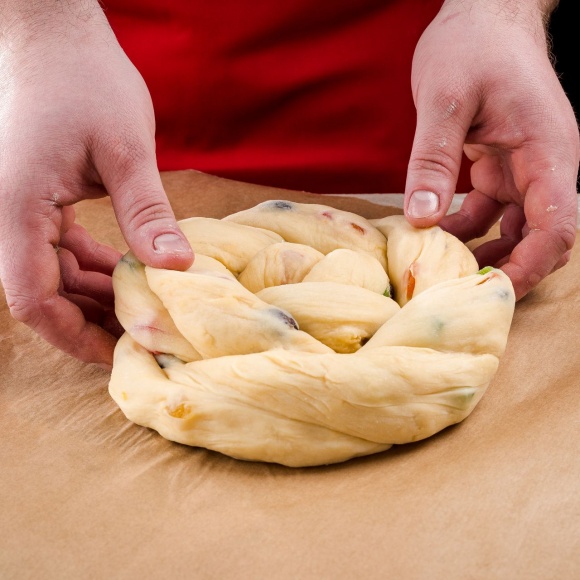 Переплетаем между собой обе части рулета, формируя жгут, затем плотно сворачиваем жгут по кругу и придаем пасхальному пирогу вид цветка.