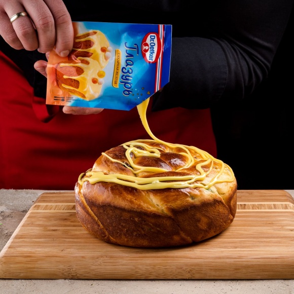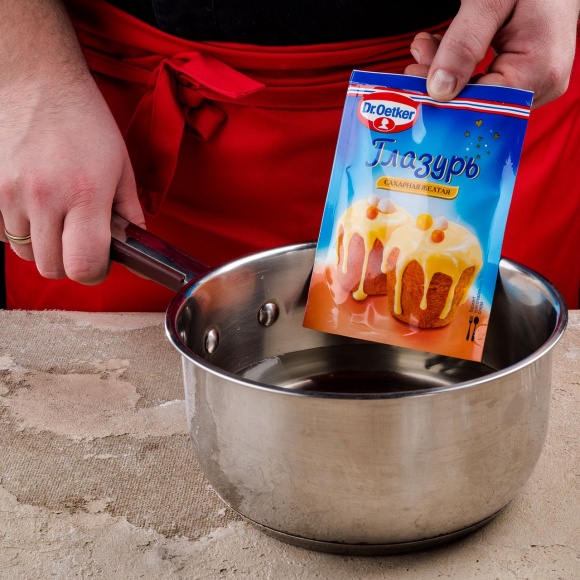 Пакетик с сахарной глазурью желтого цвета Dr. Oetker помещаем в чашу с горячей водой на несколько минут. Периодически надавливаем на пакетик с глазурью в разных местах для получения лучшей однородности глазури.