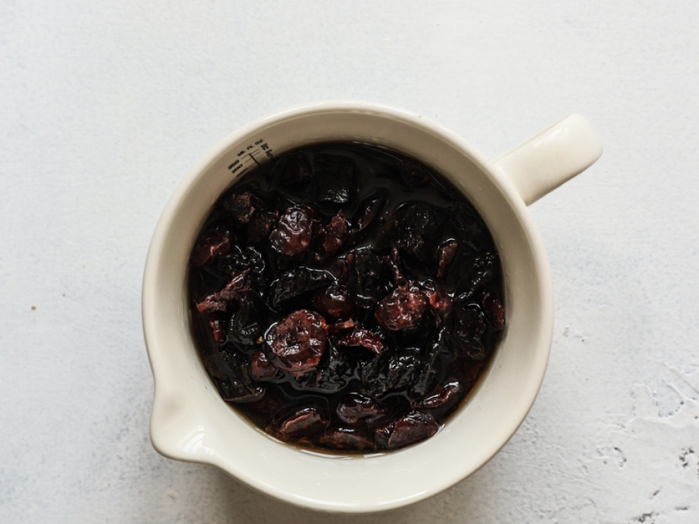 Сухофрукты замачиваем в роме на 4 часа (лучше на ночь). Вместо алкоголя можно использовать холодную воду.