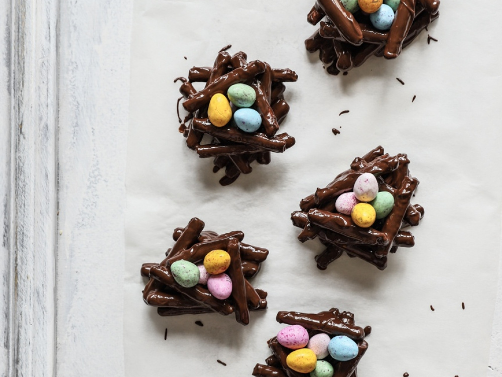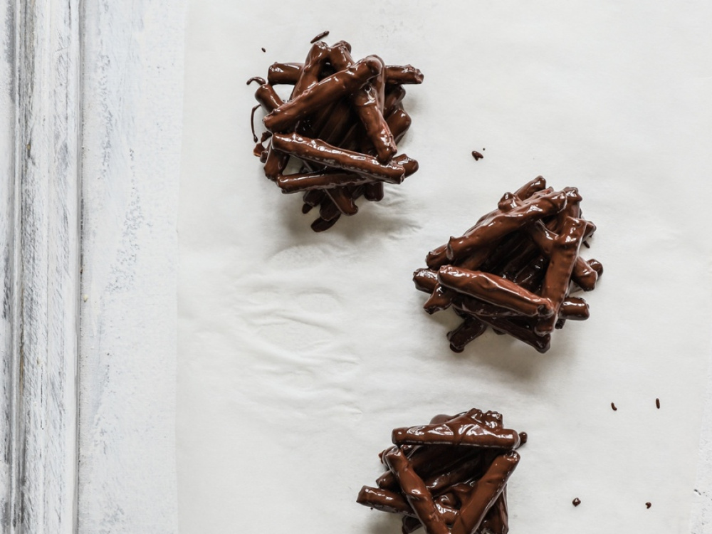 Выкладываем на пергамент соломку в шоколаде в виде гнезда.