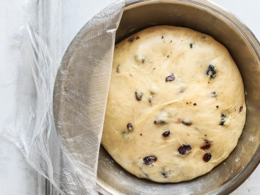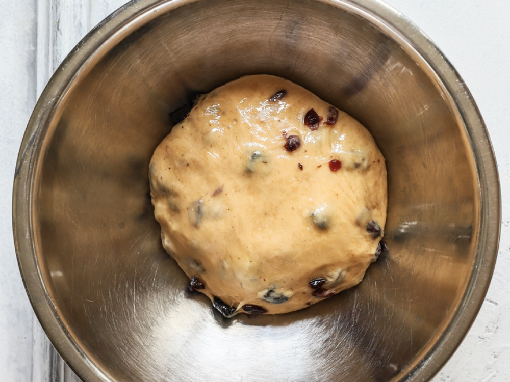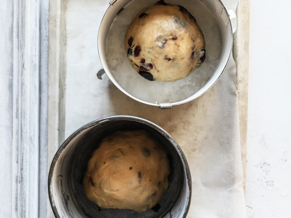 Тесто делим на две части, скатываем в шар и перекладываем в формы, смазанные сливочным маслом и присыпанные мукой (либо в бумажные формы). Оставляем тесто при комнатной температуре на настойку на 2-2,5 часа (тесто должно увеличится вдвое).