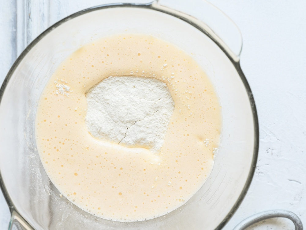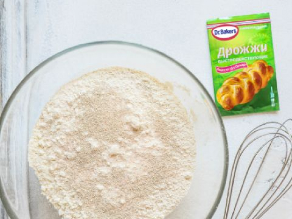 Муку просеиваем с солью и добавляем дрожжи, хорошо перемешиваем.