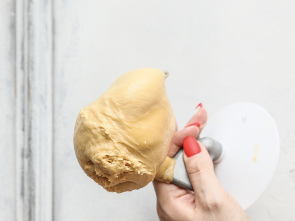 Добавляем к яйцам сухие ингредиенты и хорошо вымешиваем тесто, оно не должно рваться и хорошо отделяется от стенок - собирается на крюк.