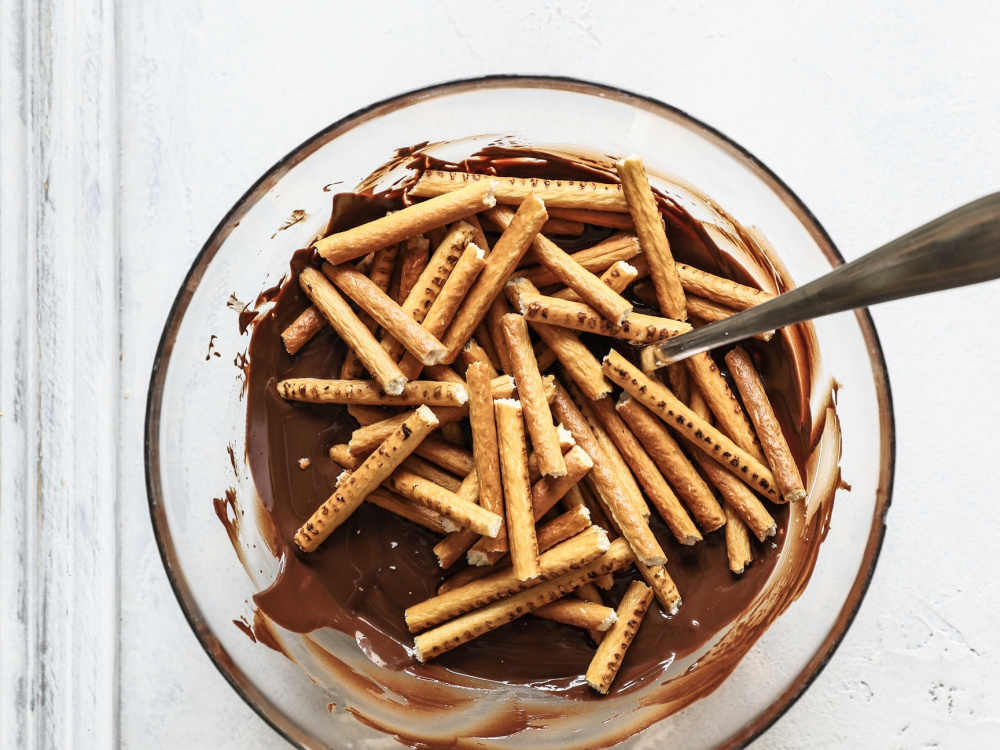 Перекладываем соломку к шоколаду, аккуратно перемешиваем.