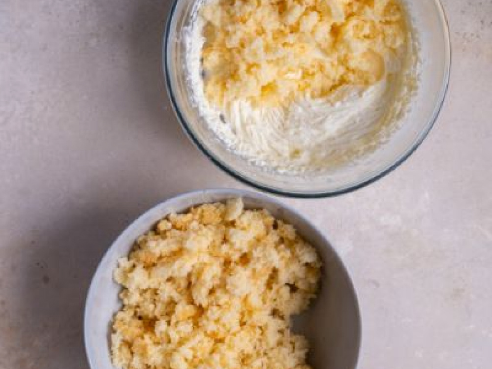 Остывший бисквит крошим на мелкие кусочки и смешиваем с кремом.