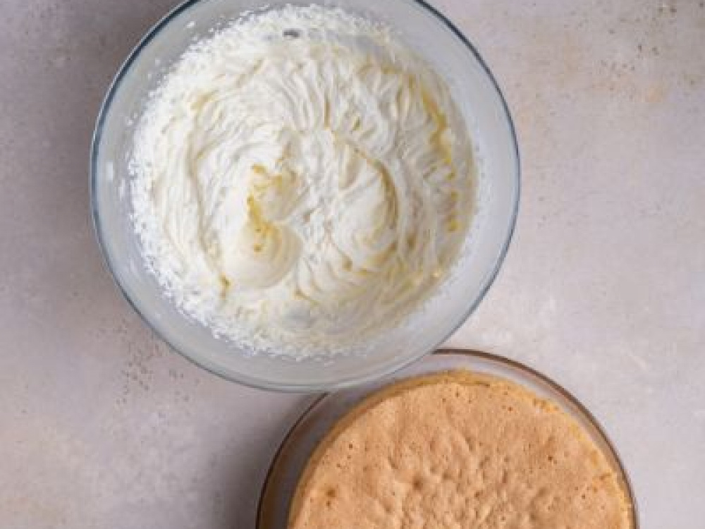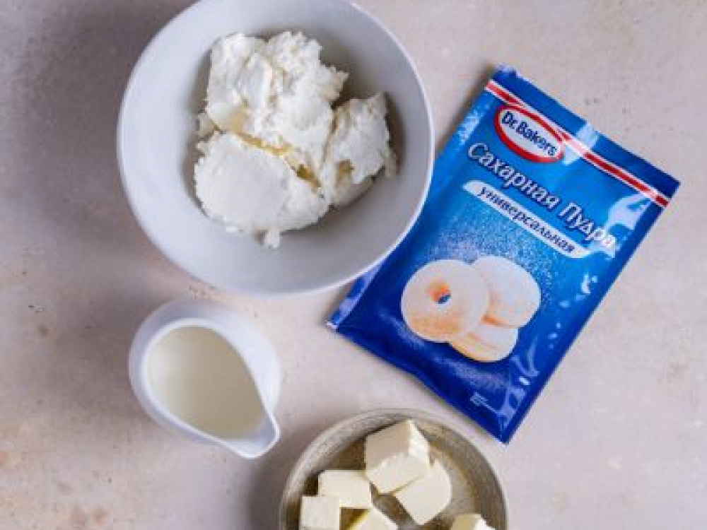 Для крема мягкое сливочное масло взбиваем с сахарной пудрой до воздушной массы. Добавляем творожный сыр и сливки и взбиваем до однородного воздушного состояния.