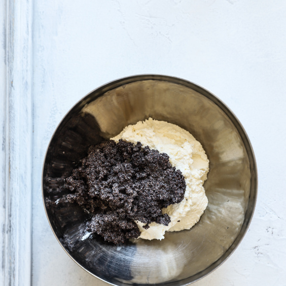 В одну добавляем маковую начинку и хорошо перемешиваем.