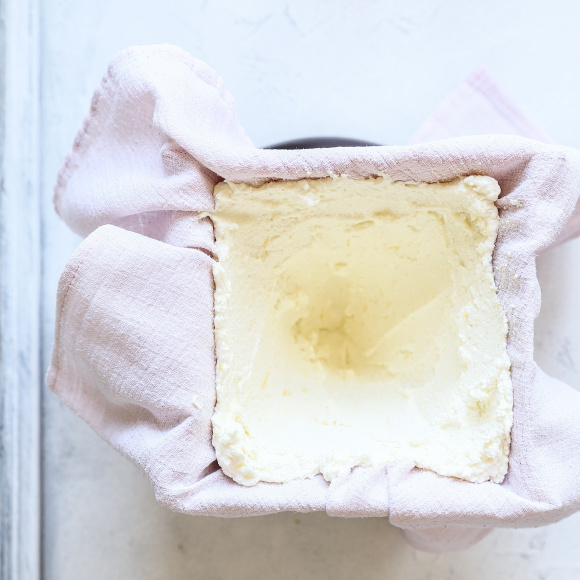 Накрываем форму марлей, ставим под гнёт и убираем в холодильник на ночь.
