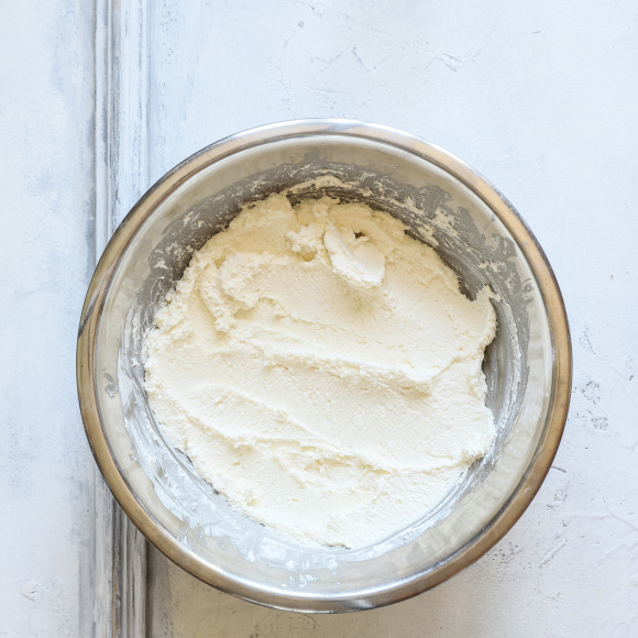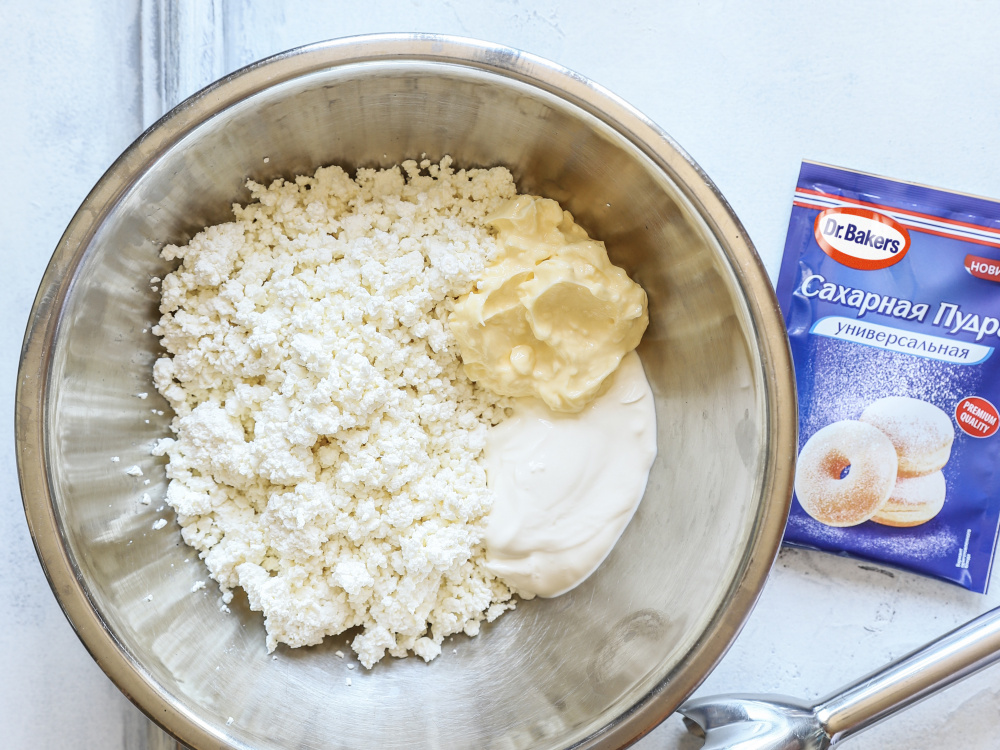 Творог пробиваем блендером с сахарной пудрой, сметаной и мягким сливочным маслом.