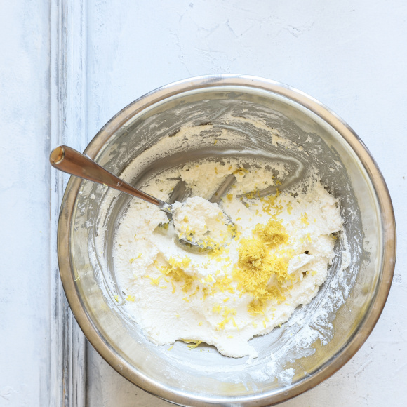 Во вторую часть творожной массы добавляем лимонную цедру и хорошо перемешиваем.