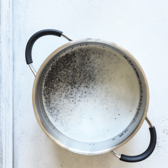 Сливаем с мака воду и заливаем молоком, доводим до кипения, кипятим 5 минут, снимаем с огня, накрываем крышкой и оставляем ещё на 10 минут, чтобы мак впитал всю жидкость.
