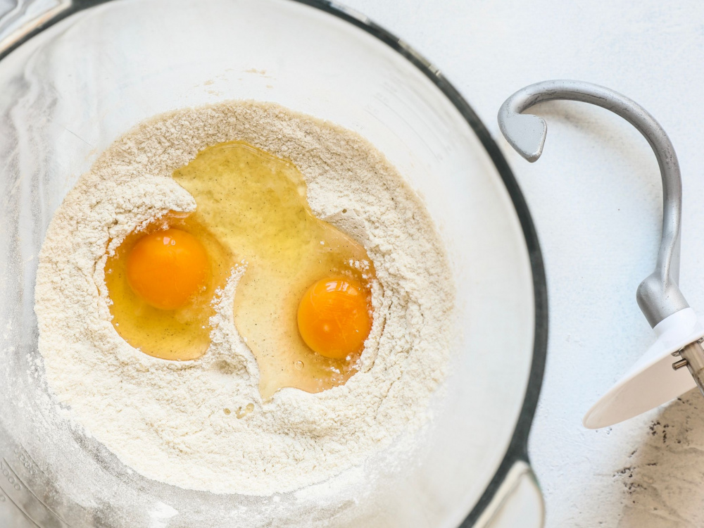 Теперь добавляем яйца, молоко и с помощью насадки «крюк» хорошо вымешиваем тесто, постепенно увеличивая скорость до самой высокой. Холодное сливочное масло нарезаем кубиком и по одному добавляем в тесто, не переставая вымешивать на высокой скорости.