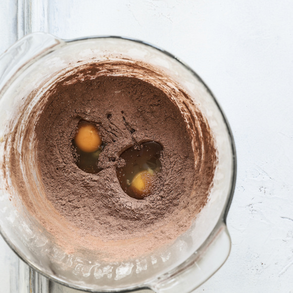 Для шоколадного теста муку просеиваем с дрожжами, добавляем какао, сахар, ванильный сахар с натуральной ванилью, соль и перемешиваем.