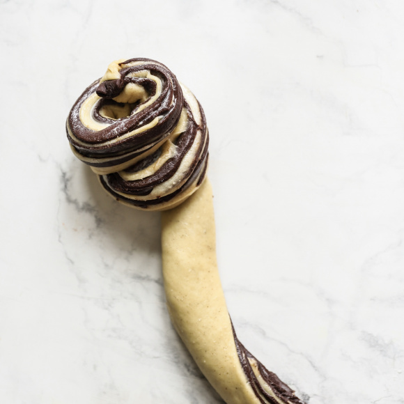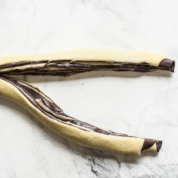 Теперь прямоугольник скатываем в плотный рулет и разрезаем вдоль пополам, оставляя с одной стороны 2 см. Закручиваем одну половину рулета срезом вверх, вторую также срезом вверх, только в другую сторону, кладём половинки друг на друга и перекладываем сформированный будущий краффин в форму.