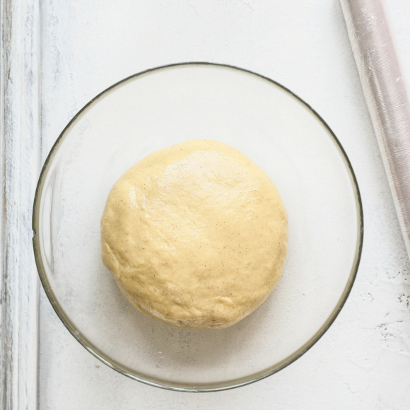 Хорошо вымешиваем тесто не менее 20 минут. Тесто должно получиться нежным, мягким и упругим. Формируем из теста шар, перекладываем в сухую ёмкость, накрываем плёнкой и оставляем на 15 минут.