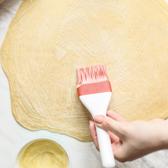 Стол слегка припыливаем мукой, ванильное тесто делим на 2 части, раскатываем половину в тонкий прямоугольник, обильно смазываем мягким сливочным маслом.
