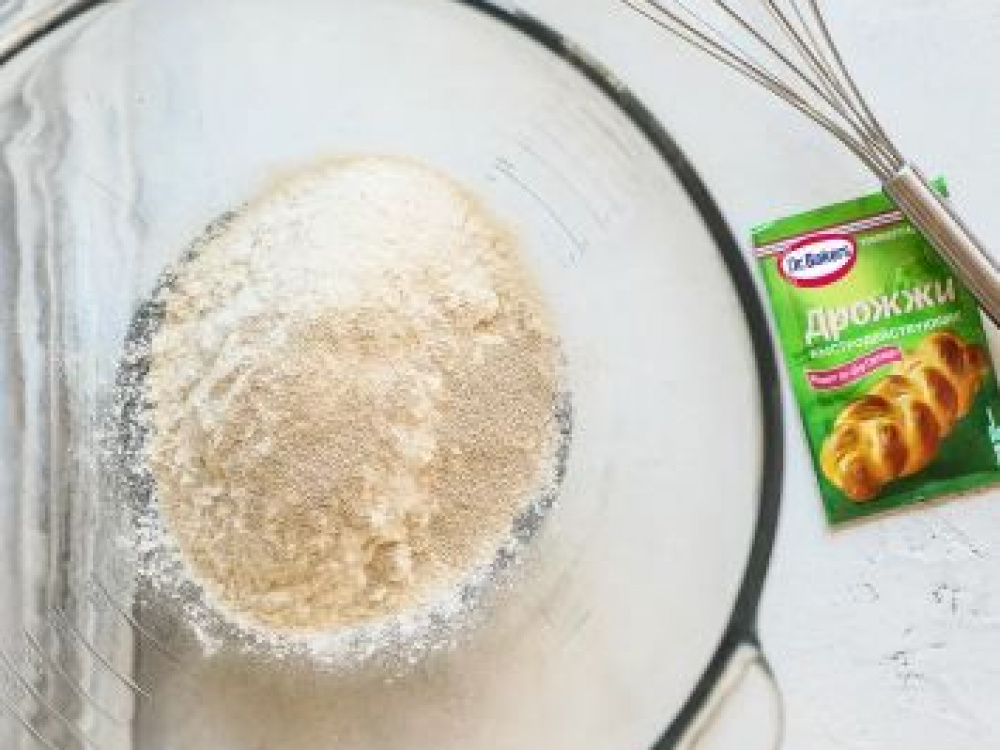 Для ванильного теста муку просеиваем с дрожжами, добавляем сахар, соль, ванильный сахар с натуральной ванилью и перемешиваем.