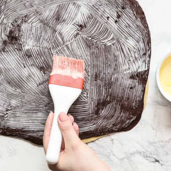 Шоколадное тесто делим пополам, раскатываем половину и перекладываем на ванильное, обильно смазываем сливочным маслом.