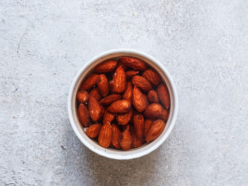 Миндаль заливаем крутым кипятком, оставляем на 10 минут и снимаем кожуру с орехов.