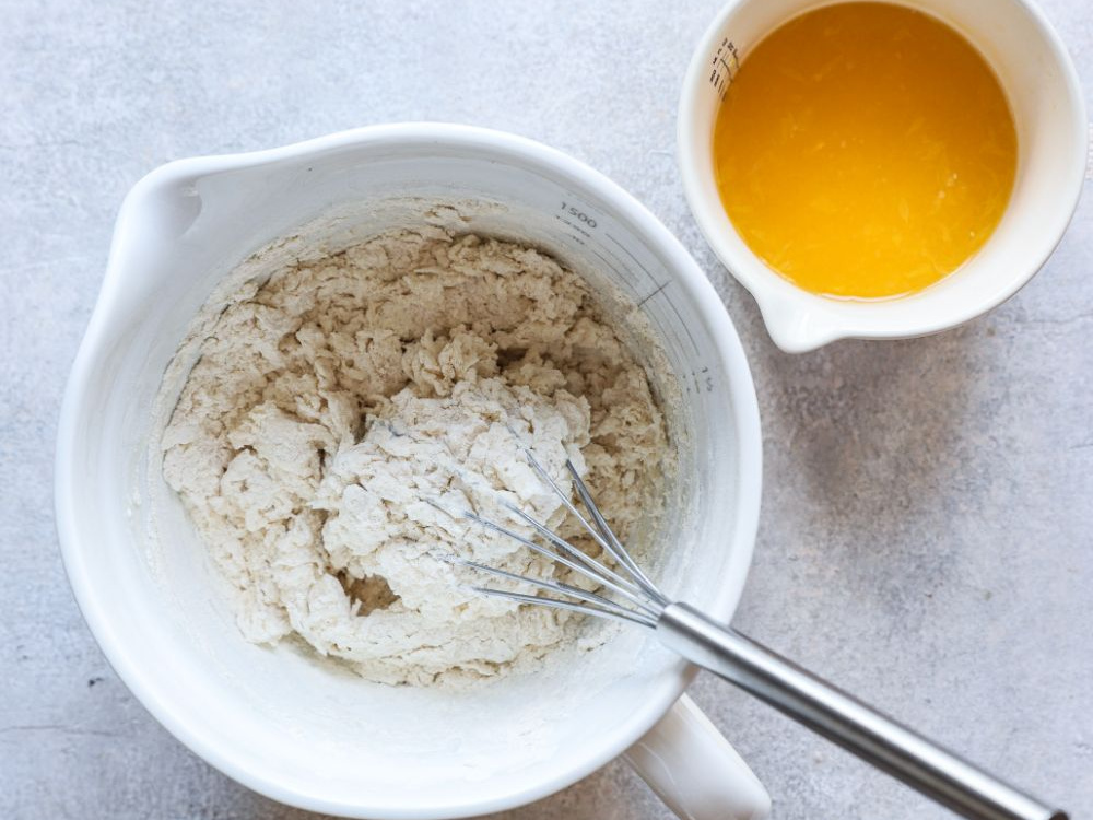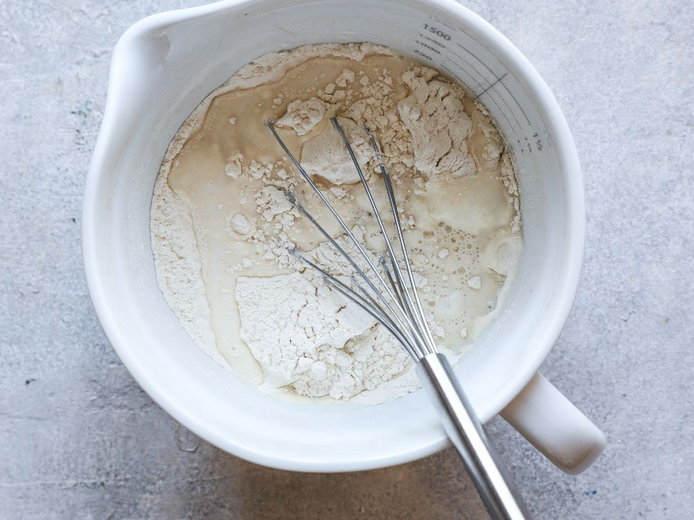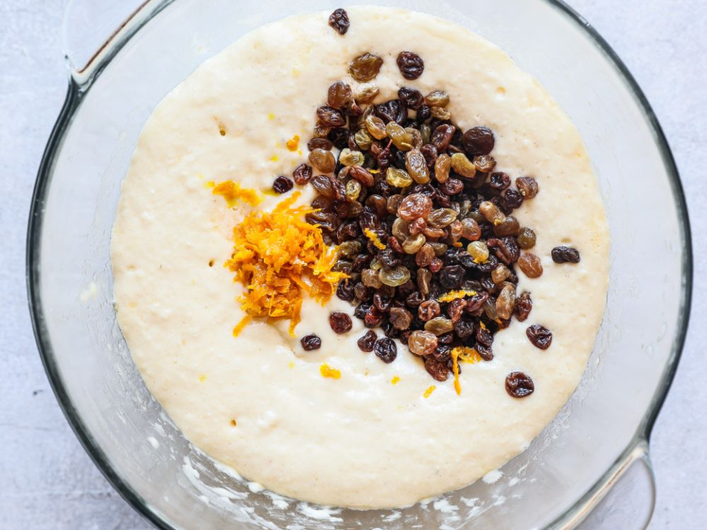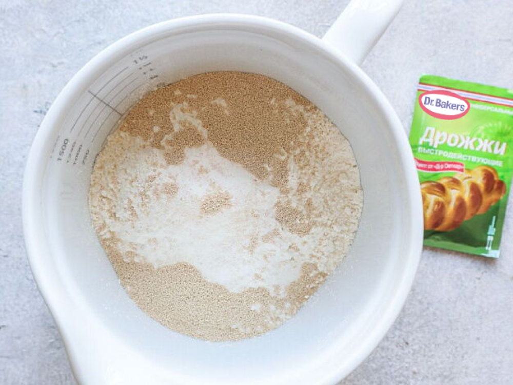 Смешиваем все подготовленные ингредиенты и замешиваем однородное тесто, накрываем полотенцем и отправляем подходить в тёплое место (для этого можно использовать духовку, разогретую до 40°С) на 1 час.