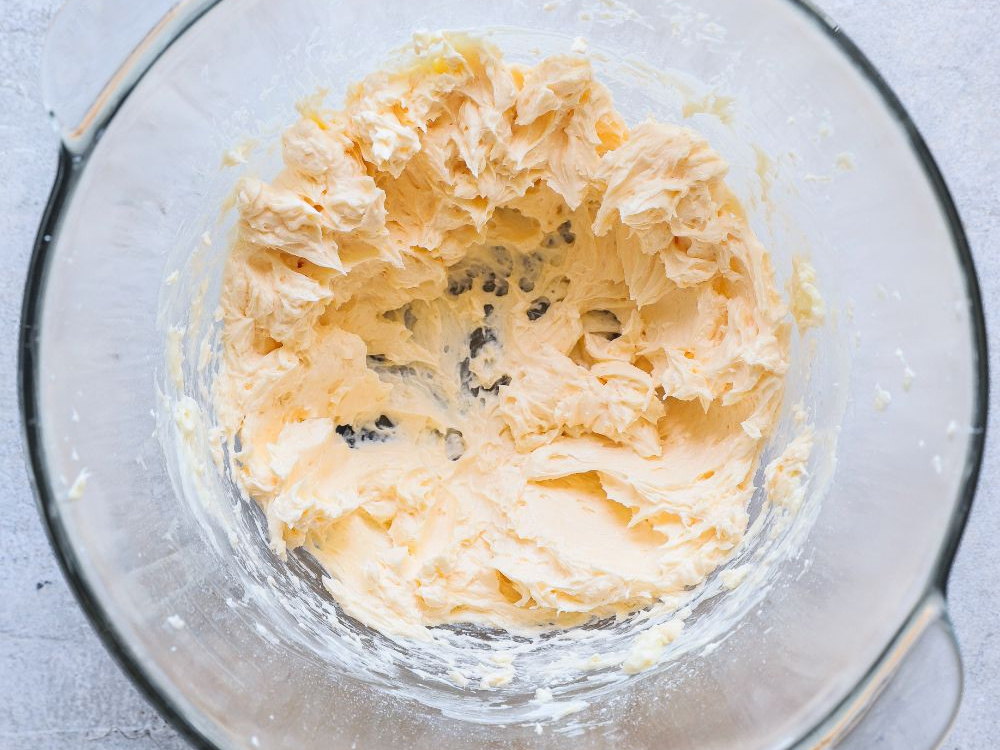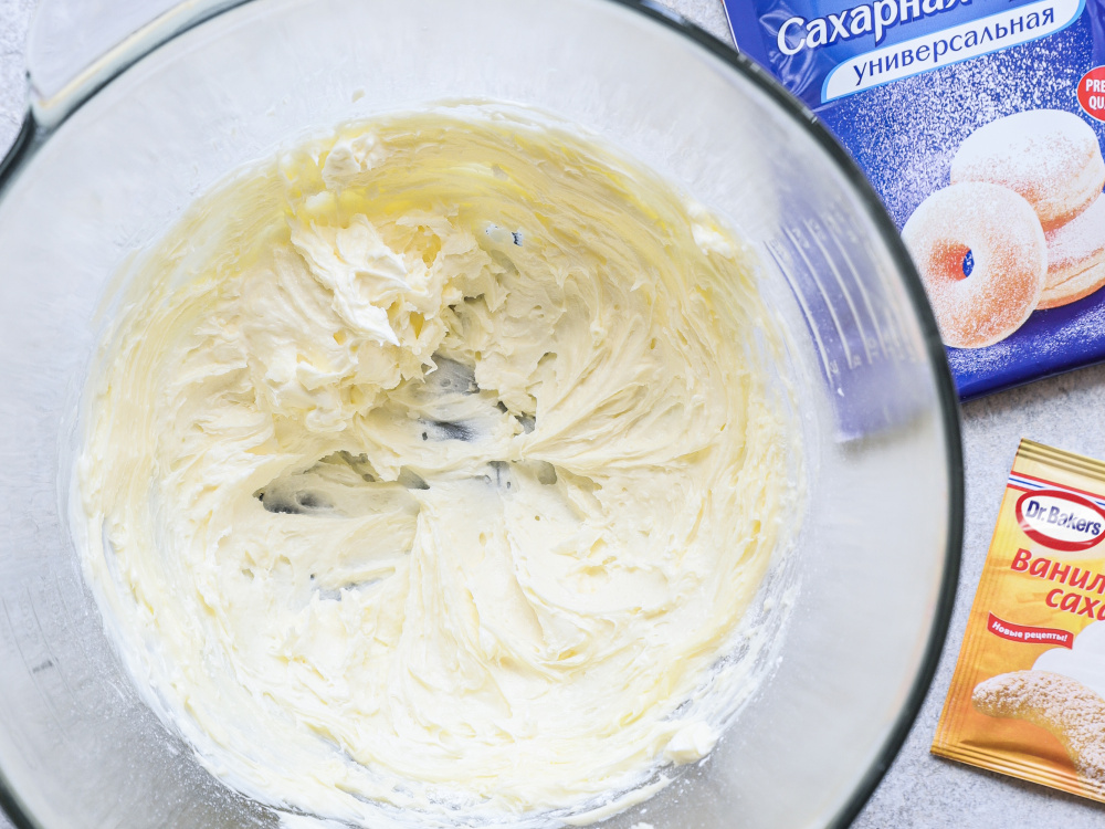 Мягкое сливочное масло взбиваем с сахарной пудрой и ванильным сахаром до пышности
