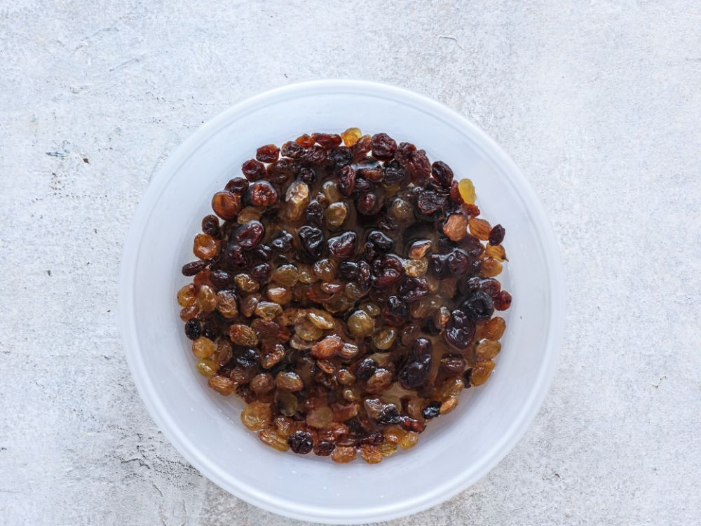 Изюм заливаем кипятком и оставляем на час, сливаем воду.