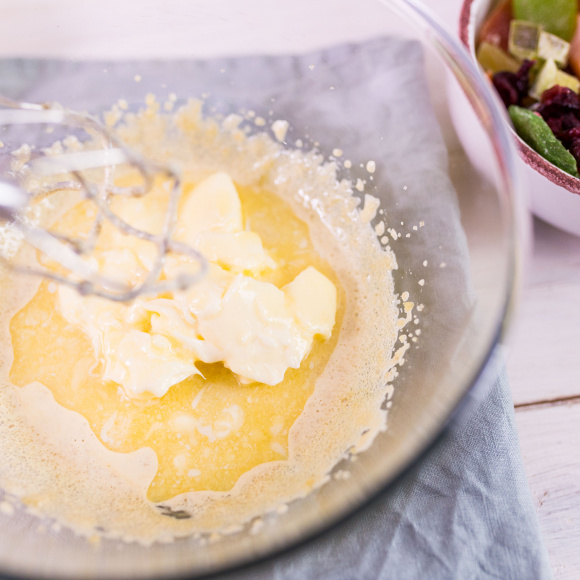 Сливочное масло растапливаем до жидкого состояния, даём остыть до комнатной температуры и вводим в тесто, после чего ещё раз взбиваем всё миксером в течение 7-10 минут на высокой скорости.
