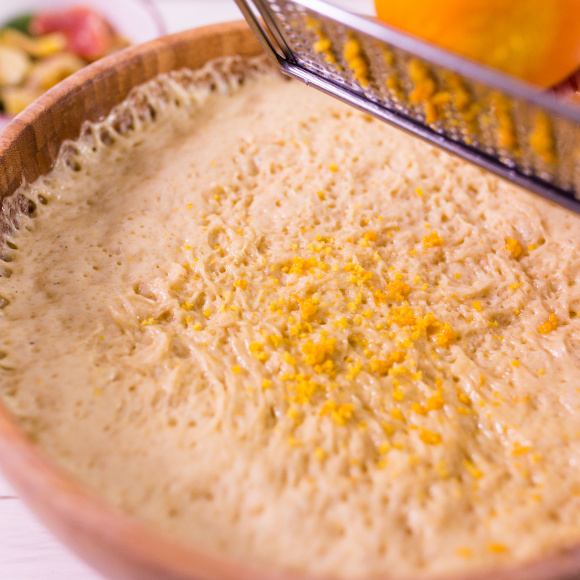 На мелкой тёрке измельчаем цедру спелого апельсина, после чего вмешиваем цедру в тесто.